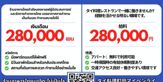 【タイ料理シェフ・調理補助 募集】マイペンライ(東京都・町田市)